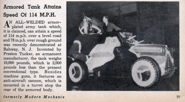 es el Tucker Combat Car. Tucker, el de la pelicula, aquel genial inventor y constructor de coches un poco utópico, diseñó en 1938 este diablo sobre ruedas que según él llegaba a las 65 millas por hora en todoterreno...
