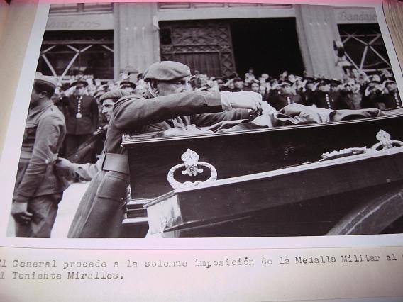 Entierro del Teniente de Caballería Manuel Miralles Álvarez muerto en el frente de Batalla al que se le impuso la Medalla Militar con todos los honores.El General López Pinto procede a la solemne imposición de la Medalla Militar al Cadáver del Teniente Miralles.