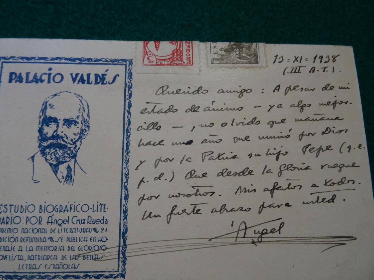 - El primero y creo que mas interesante, es una tarjeta postal que envía el alcalde la localidad de Cabra (Córdoba), el 13 de noviembre de 1938, a su amigo el cronista José María Rey Díaz, al cumplirse el primer aniversario de la muerte, posiblemente en la guerra civil, del hijo de este último.