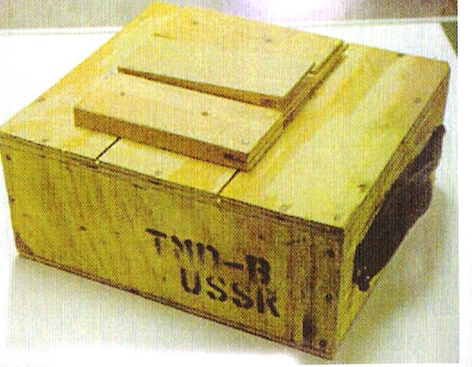 ExactoMina soviética TMD-B.Usada en la URSS, Vietnam, Líbano...y como no, Yugoslavia y Afganistan. Mide 32x28x16 cms y pesa cargada casi 10 kg. Tiene uso como anticarro y contrapersonal, de las tres tablillas de la parte superior, las de los extremos son fijas y la del centro se puede levantar gracias a una bisagra, esta tablilla tiene un resalte inferior que se encaja en el cuerpo de la caja sobre el percutor, sometida a una presión de 20 kg; si le ponemos el listón que se ve en las fotos, la presión se eleva a 135 kg pues trabamos el descenso de la tablilla hasta que se parte el listón, siendo así su uso contracarros.