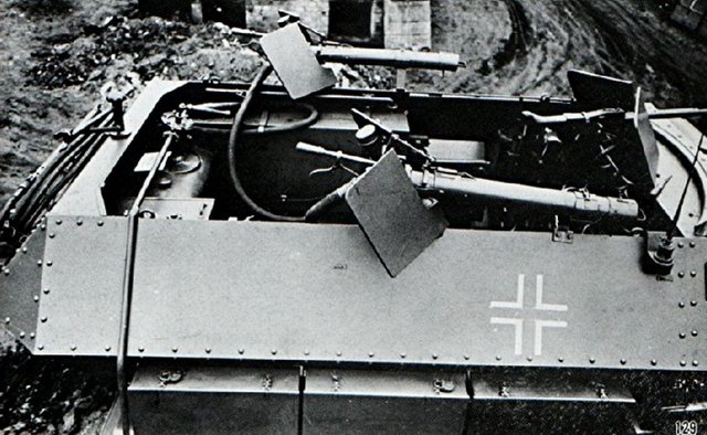 Es un SdKfz 251/16 Flammpanzerwagen. Version lanzallamas del ubicuo 251. Equipado con dos Flammenwerfer de 1.4 cm y dos MG. Cada uno de los lanzallamas (uno a cada lado del vehiculo) tenía un angulo horizontal de 90º y de hasya 40º de elevación. Contaba con combustible suficiente para 80 descargas de unos 2 segundos cada una y un alcance de unos 35 m. según las condiciones del viento.