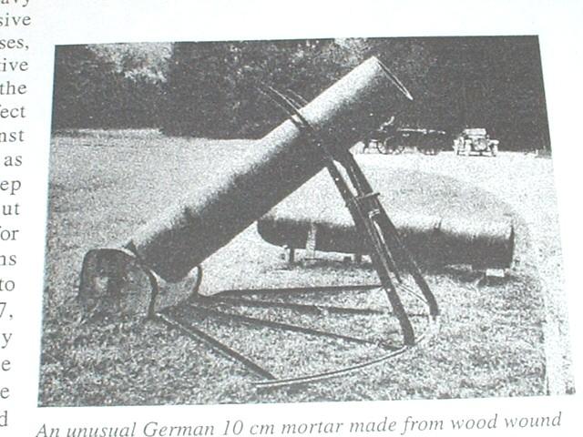 Se fabricó en tres calibres: 25, 35 y 45 cm, y tenía la particularidad de que estaba hecho ¡de madera! El tubo era un conjunto de gruesas tablas de madera, colocadas de forma que formaran una sección circular, y todo ello zunchado con alambre grueso. La base del tubo era redondeada y descansaba en un sólido tarugo de madera. El conjunto se sostenía con un simple bastidor metálico y el mecanismo de elevación era un tornillo. Dadas las caracteríticas del arma, el alcance no era muy grande, pues eso hubiera supuesto una carga de proyección importante, con la consiguiente gran presión en el tubo.