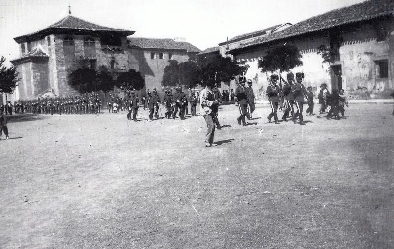 Esta fotografía es de un desfile militar en Palencia, la fecha de dicha fotografía sería de finales del S. XIX o principios del XX. 20 metros atrás se encontraba el cuartel de San Fernando (ya desaparecido).