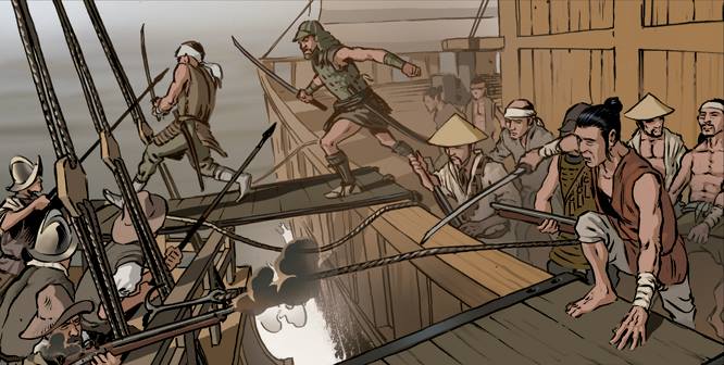Otro detalle, es que nos eran del todo samuráis, eran ronins: son samuráis sin señor que se dedicaron a la.pirateria para vivir. Ademas de piratas. Pero el tema es que un ejército profesional, con sus armas, y tácticas, podia con uno 3 o 4 veces superior. Y en este caso, mucho más.