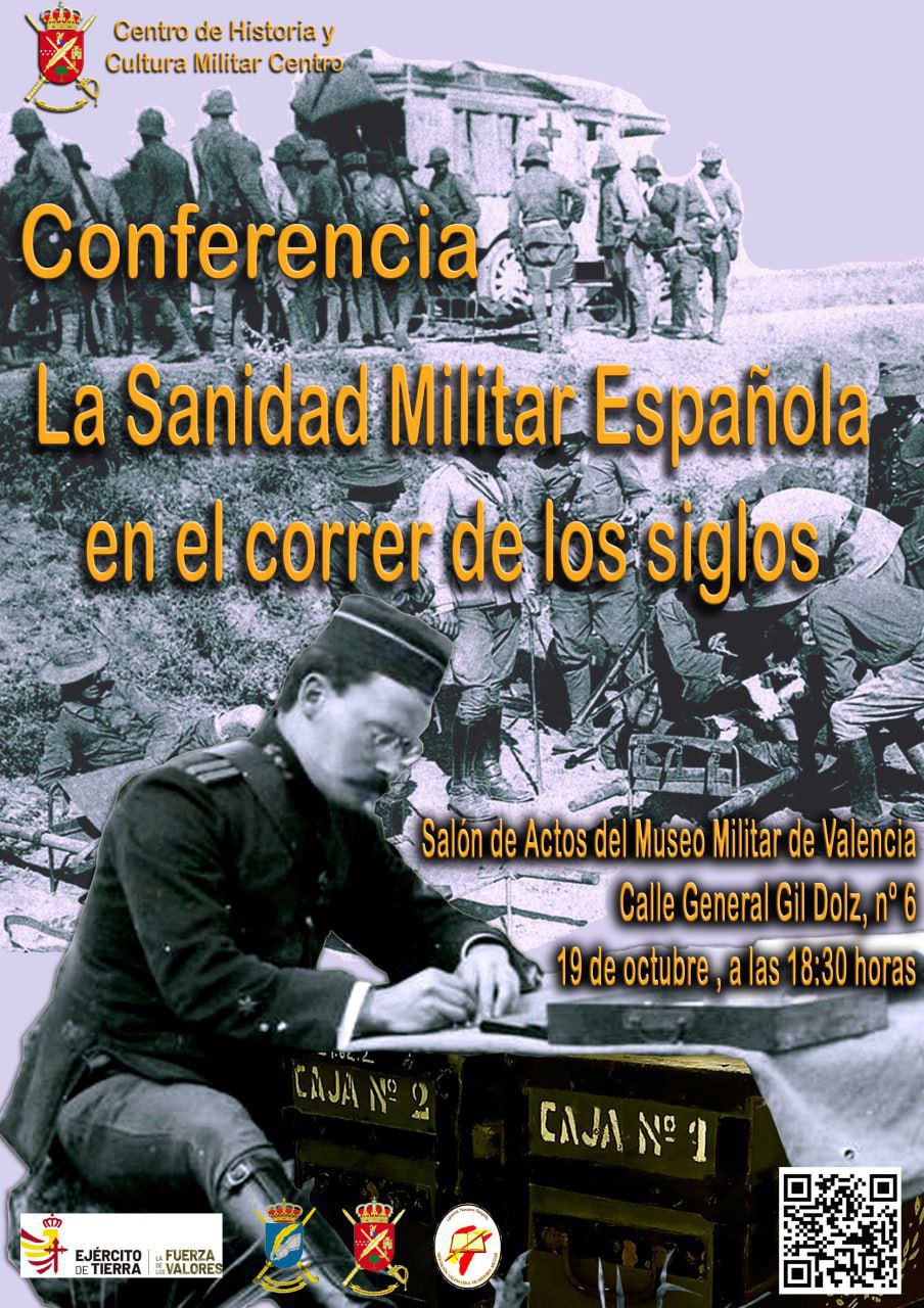 que anuncia la presentación de la Conferencia, “La sanidad militar española en el correr de los siglos”, que será impartida por el Teniente de Navío CGA (RV) D. Juan José Sánchez Garrido, y se efectuará el 19 de octubre de 2023, a las 18:30 horas, en el salón de Actos del Museo Militar de Valencia, sito en la calle General Gil Dolz, nº 6. Una semblanza y homenaje a la Sanidad Militar.