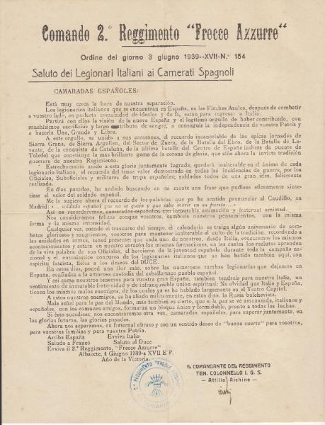 Invitado escribió:Hola un señor que estuvo en la division italiana FRECHAS AZURRES ( o parecido ) pues se trata de compañias o batallones mixtos de Españoles e Italianos pero con mando Italiano, buscare algun documento relacionado directamente con esta division, pues por suerte tengo interesantes documentacion de este division Italiana, se trata de la misma placa metalica de brazo y la misma medalla, que si el amigo la mira bien lo de flechas azules lo pone en italiano tanto en la medalla como en la placa de brazo.