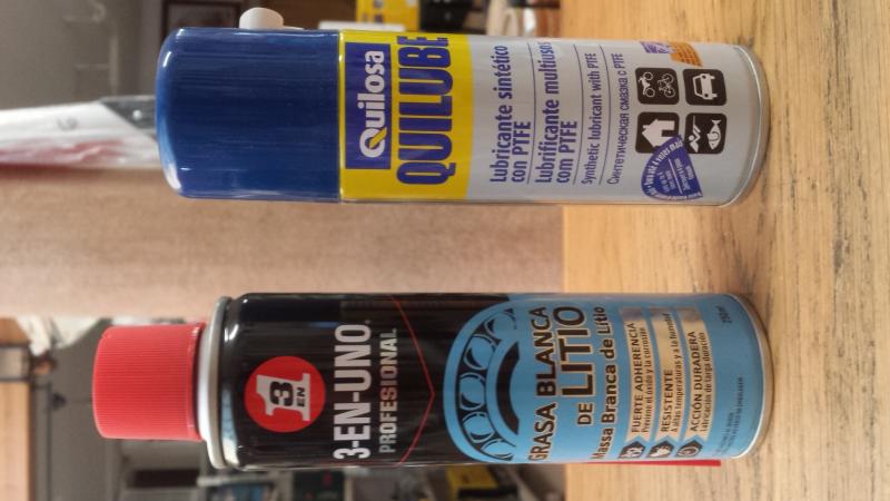 Grasa blanca de litio tienes la de 3 en 1,tanto en spray como sintetica en tubo,el lubricante de teflón de la marca quilosa(quilube),y lo tienes igual en spray o en sintetico en tubo.