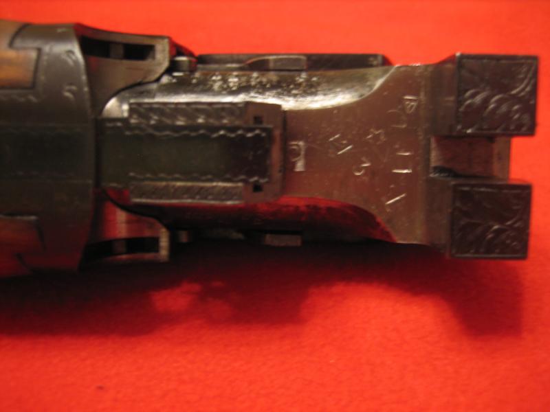 Sin embargo, posiblemente de las jornadas de caza, la báscula estaba algo sobada sobre todo por la zona inferior, así como la rabera del guardamontes y la llave de apertura del guardamanos. Y luego, el sistema típico de la B25 de guardamanos fijo al cañón, hace que de montar y desmontar la escopeta se vaya gastando la parte del cañón inferior en una franja de un centímetro de anchura, que es lo que corre el guardamanos hacia delante y hacia atrás.