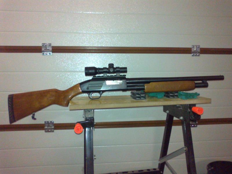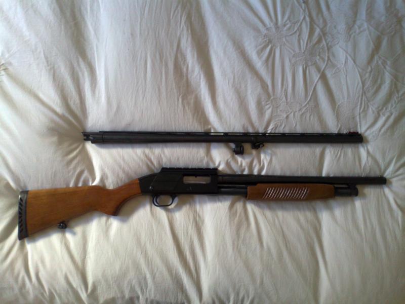 Mossberg Maverick 88, dos cañones, uno de 71cms con 3 polichokes y otro de 47 para tirar con bala.