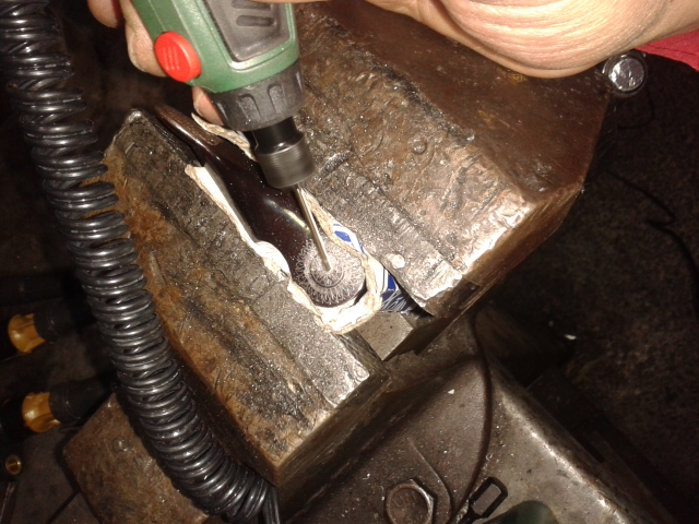 De momento he hecho un buen boquete con la direccion correcta. Cuando lo acabe creo que en vez de soldar voy a roscarlo con un macho y a dejarlo con un tornillo bien puesto y oculto bajo un poco de nural lijado antes de pintarla. Asi si pasa de nuevo ya tengo desde donde acceder con facilidad