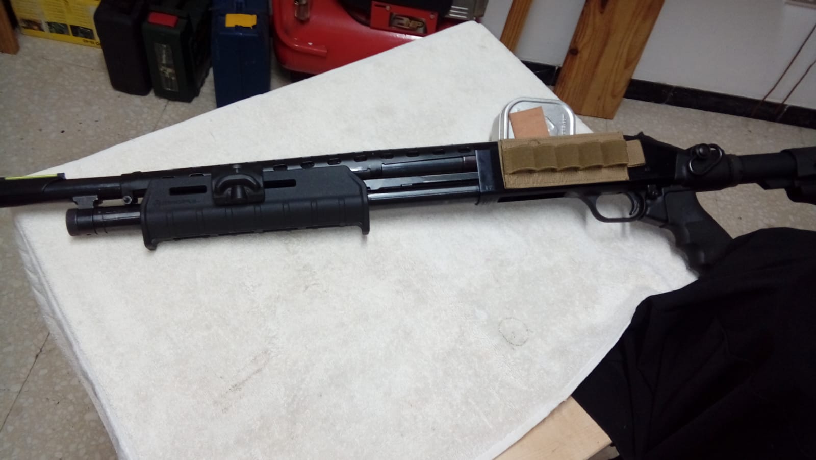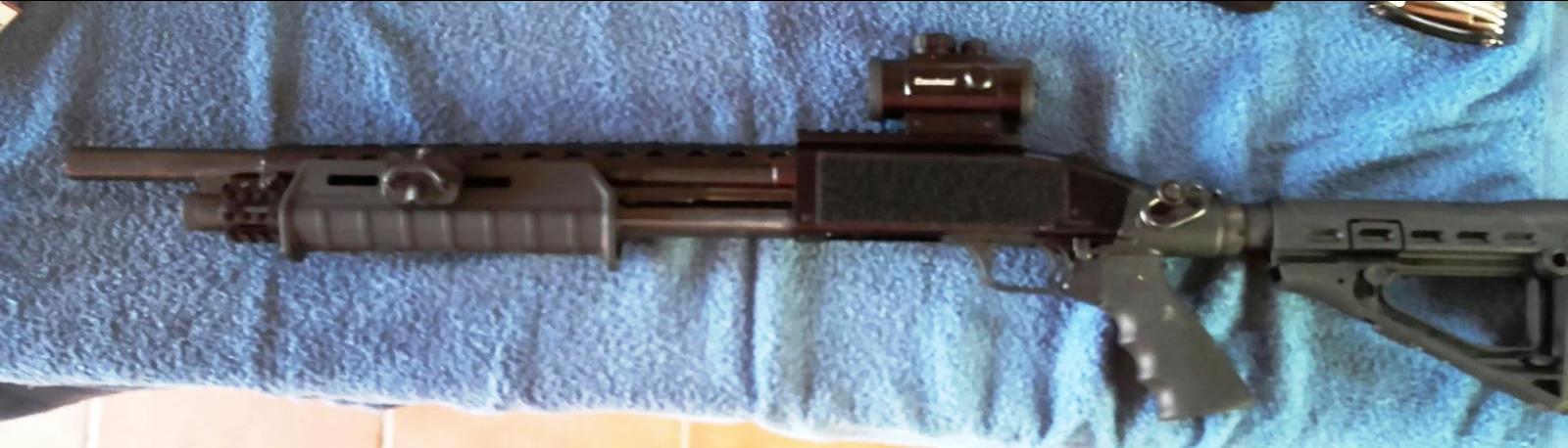 Un compañero del club vende una Mossberg 500 con tres cañones de diferente longitud, culata y guardamanos Magpul, rail, culata retractil, el porta cartuchos lateral, un pequeño escudo termico(no se si viene o se lo puso) y la pieza redonda que va delante del guardamanos que trae tres pequeños carriles.