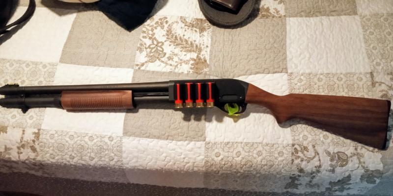 Es una Remington 870, carga 6+1 cartuchos, le he cambiado la culata y guardamano del feo plástico que traía de serie por el modelo police en madera, montado una cartuchera para 4 cartuchos y un punto de fibra verde y cambiado el seguro junto al guardamonte por uno extendido. Necesito consejo para mejorar la recarga supongo que cambiando la teja ¿Pero cuál y donde comprarla?Espero que guste amigos.