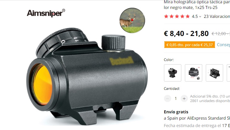 manolosolo escribió:Con consultar el catalogo original de Bushnell, ya te das cuenta, de que ese visor chino de 30 €, marcado con por lo menos otras 20 marcas distintas mas, no es original, y mas cuando ya hace unos buenos años que no fabrican visores de enfoque en el objetivo, y vamos, el que crea que puede comprar un visor de marca por 30 € en Aliexpress, es que no tiene ni idea.