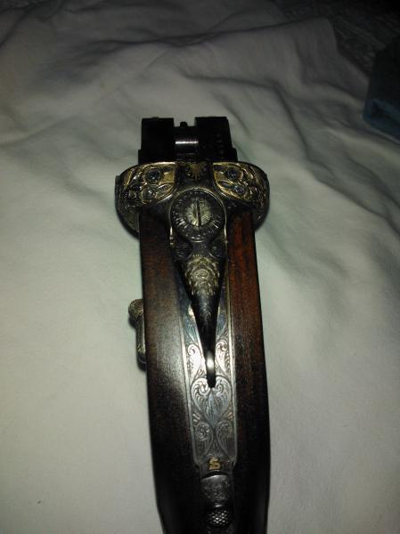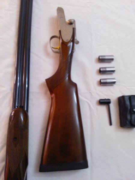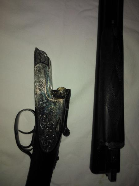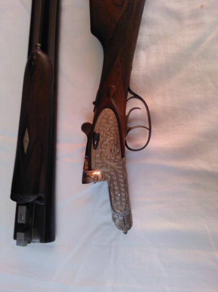 - La otra es una Luis arrizabalaga ,expulsora ,doble enganche y cierre purdey, con salida de gases, orejillas de refuerzo y grabada a buril muy fino, 72cm de cañón con punto de mira de marfil original, choques 3 abierto y 1 abierto, cañones demiblok, gatillo articulado, maderas de raíz de nogal ,con lagrima y a la inglesa sin pistolet, se hizo por encargo en el año 62. Pletinas largas desmontables con llavin,la báscula tiene 1'5 mm mas de anchura que otro modelo normal esta valorada en 1000€ aprox. Esta perfecta, totalmente nueva.
