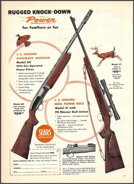En el catalogo de 1955 verá la luz por primera vez en la historia una semiautomática por acción de gases el modelo será denominado J.C.Higgins 60 bajo el nombre de Sears y Supermatic C-100 bajo el nombre de la Higt Standard que es la autentica empresa que la ha diseñado y que está a cargo de su producción.