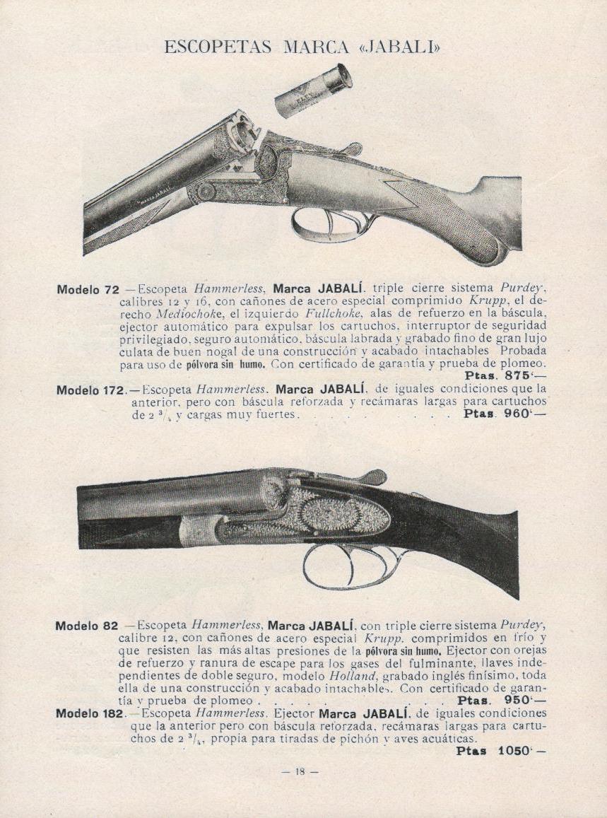 La escopeta es de 1926, es el modelo 182 para tiradas de pato y pichón y te adjunto hoja del catalogo. Sin ser un modelo Best es una señora arma. Es un poco cerrada como muchas Schilling pues los choques equivaldrían hoy a 1 estrella el izquierdo (9 décimas) y 3 cerradas en el derecho -casi 2- (6 décimas de estrangulamiento).El interior del ánima es de 18,4 mm medida también normal en lacasa Jabalí y que debe hacerla un poco más “pegona” que si tuviese 18,5mm que es lo normal, aunque en esa época otras marcas extranjeras como Lebeau-Courally ya utilizaban 18,6, 18,7 y 18,8mm. y que hoy se han puesto tan de moda. Las recámaras son de 70mm, por lo que puedes utilizarla sin problema con la cartuchería actual. Los cañones son de acero alemán Krupp, uno de los más usados por Schilling de una calidad fuera de toda duda. La longitud de 76cm se debe a encargo del cliente pues aunque he visto varias como ella, la mayoría eran de 68 o 70cm. Posee buenos grabados aunque tal vez un tanto austeros y un pequeño detalle de lujo como es el doble tornillo en la palanca cimera.