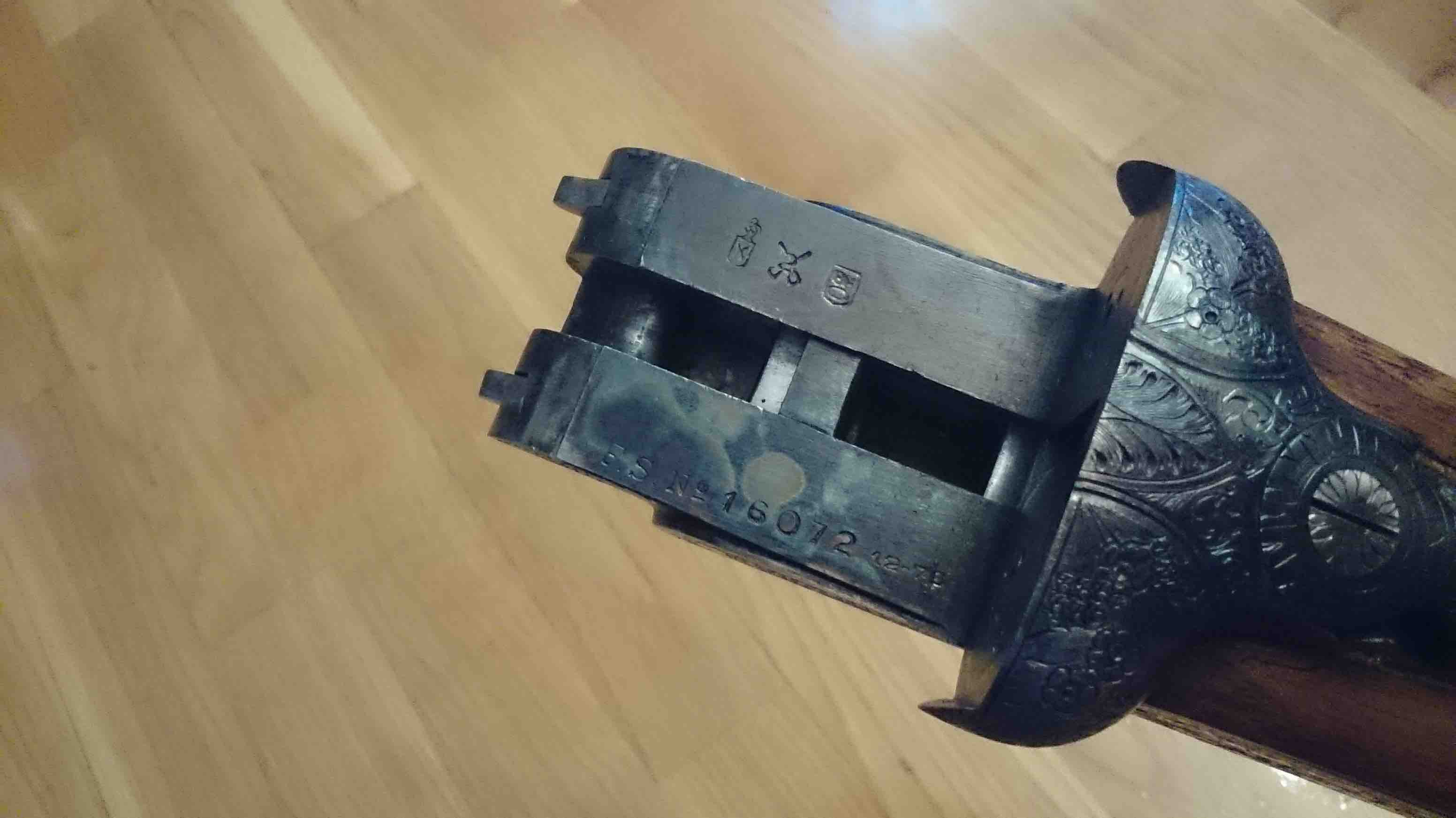 Queriendo gastar poco dinero, tenía claro que encontrar una Arrieta o una AYA con esas premisas no iba a ser fácil así que puse en un segundo plano el tema fabricante. Después de mucho buscar, me encontré con esta TRUST EIBARRÉS con cañones marcados FS (Francisco Sarriugarte?) de 71cm. en el estado que se ve en las fotos. Sólo he tenido que repasar un poco el pavón y las maderas para conseguir el estado que se ve en las fotos. El jaspeado estaba perfecto... Por lo demás, la escopeta estaba impecable de presencia y con un ajuste espectacular. Como añadido a las todas las características que buscaba (que, creo, las tiene), tenemos el triple cierre Purdey como garantía de robustez. Las recámaras son de 18,4 como podéis ver en los marcajes.
