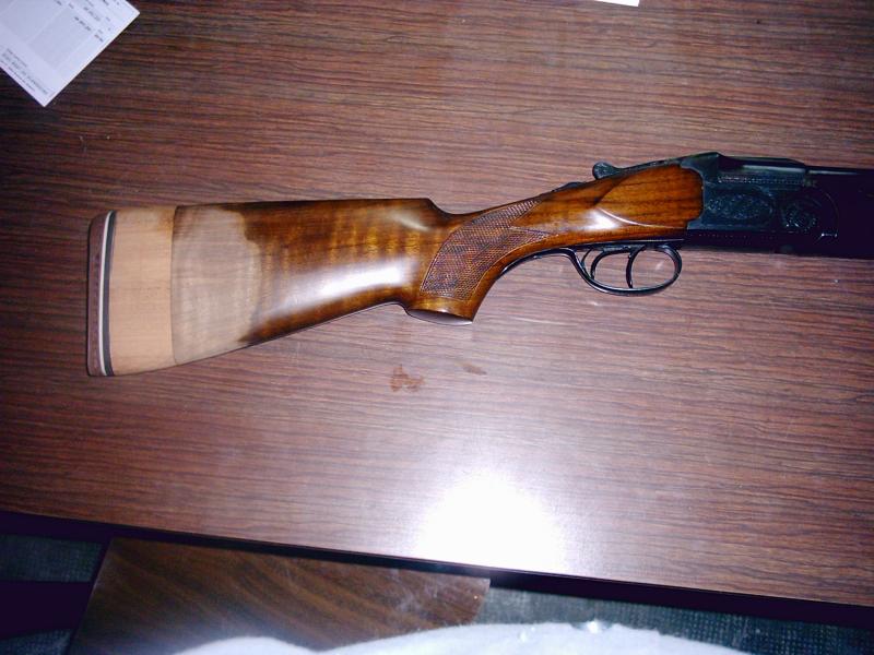 Pues hablando de chapucillas, ahí va la mía en la B25, la escopeta estaba impecable y con muy pocos tiros pero habían cortado demasiado la culata, claro, la opción de adquirir una nueva es muy cara, es de nogal francés de una calidad que asusta y con la coloración tan típica FN, bueno, pues la cuestión es que yo he utilizado los gruesos para estos menesteres para conseguir, respetando la cantonera original, llegar a los 36,5 cm que es mi medida buena, también en este apaño he conseguido rectificar el pich.