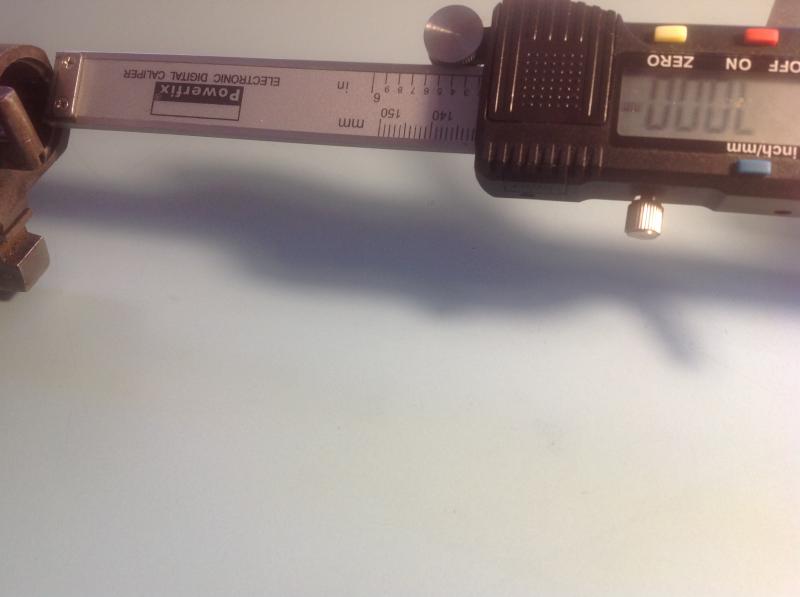 Incluyo una foto de lo que se me ocurre para medir. Con un pié de rey fijado a 70 mm. y usando la barra de profundidad para buscar el escalón entre la recámara y el cañón, que más que un escalón es una pequeña rampa.