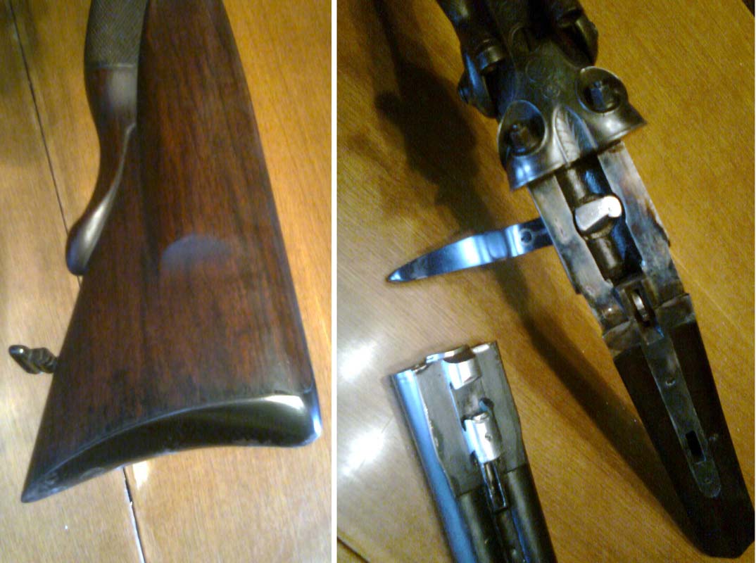 La escopeta es una preciosidad pero me temo que solo podrás disparar con ella con pólvora negra, por que ese sistema de sierre con palanca a bajo es del siglo XIX y solo soporta presiones bajas de manera que solo pólvora negra si disparas con nitro se te desajustará rápidamente.