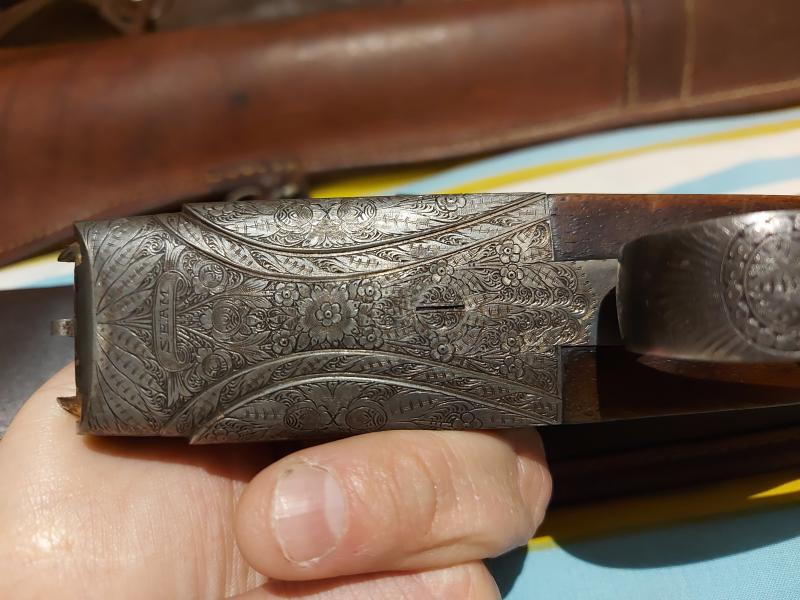 Ya que me he calentado después de tantos años, voy a intentar subir foros de otro par de escopetas. La primera se trata de una SEAM. Tal y como leí en el foro en su día, SEAM fue la sociedad de dos alemanes que compraban armas a diversas fábricas, unas de más calidad y otras de menos, y les grababan su nombre en los cañones. La escopeta en cuestión la adquirí en una subasta de armas por un precio bastante bajo. Externamente le vi detalles de escopeta fina pero allí no me dejaban trastear mucho la escopeta y al final me animé a pujar. Como suele pasar con estas cosas, no quise hacerme muchas ilusiones para no llevarme un fiasco muy grande pero cuando por fin pude coger la escopeta y desmontarla en casa me llevé cierta alegría (contenida porque no sé muy bien el valor real de la escopeta) cuando vi en la báscula un punzón con forma de rombo y en su interior una Grulla grabada, la palabra Grulla debajo y otro punzón con las letras U.A, por lo que entiendo que la fabricó Grulla para SEAM, no? La escopeta es bastante bonita y está razonablemente buen conservada (es de 1962) y creo que merece la pena ponerla guapa.