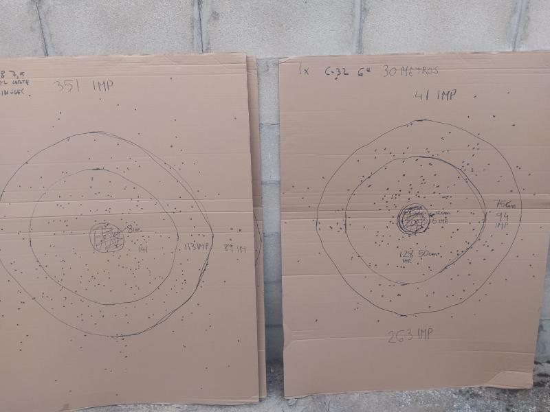 dos plomeos a 30 metros,del 7,5(28gramos) y del 6(32gramos) ambos del corte inglés(jg se supone) aparecen los claros....