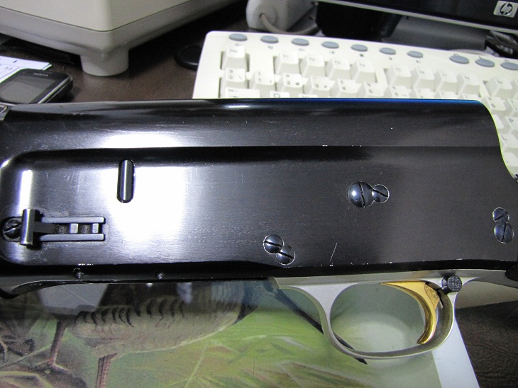 Pero después, compré de segunda mano la escopeta que te voy a mostrar,(La SuperAllegé que tú me has descubierto, eres un fenómeno) y al no ver el agujero para sacar el pasador por el lado izquierdo del armazón, nunca la he sacado el conjunto de cierre.Para mí siempre ha sido un misterio. Es posible que pueda salir por el hueco dejado al desmontar el interruptor de depósito, pero nunca me he atrevido a hacerlo.Ten en cuenta, que en la del 20, lo he hecho al menos seis veces, dos de ellas para cambiar el extractor izquierdo, que tiende a desgastarse con los miles de tiros de aquellos tiempos, y es preciso el sacar el cierre.También tuve que cambiar el pasador, pues con tanto tiro pierde su superficie lisa.La del 12 no ha conocido tantos tiros,ni tiene la calidad de la 20, ni de la Sweet sixteen impoluta que tú tienes, que por cierto, según mi tío, era "la Gioconda de las escopetas", insistía en que el equilibrio de la 16, y su vaivén, eran como el sonido de un Estradivarius. Es posible que la SuperAllegé fuera incluso mas cara, pero ni de coña tiene la resistencia de las otras, creo que como esas armas, no se ha hecho nada en los dos últimos siglos. Me apresto raudo y veloz cual corzo a sacar unas Afotos en detalle de la S.Allegé, para que veas el nº de serie y sus particularidades. Tengo el maletin original Browning, para los dos cañones, etc.