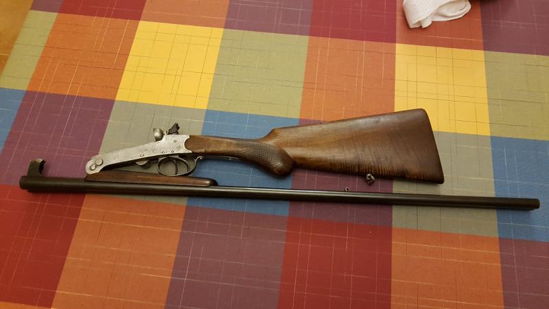 Es muy posible que se trate de una escopeta monotiro del anticuado, obsoleto, oscuro y olvidado cartucho de escopeta de 9 milímetros (9MM o 9 M/M). El Chimbo y Trusto hicieron bastantes de ellas. Si pudieras pasar fotos se agradecería, asi podríamos identificarla definitivamente. Tienes mas información en la pág 254 del hilo de recarga de escopeta. La mia es Trust y es así: