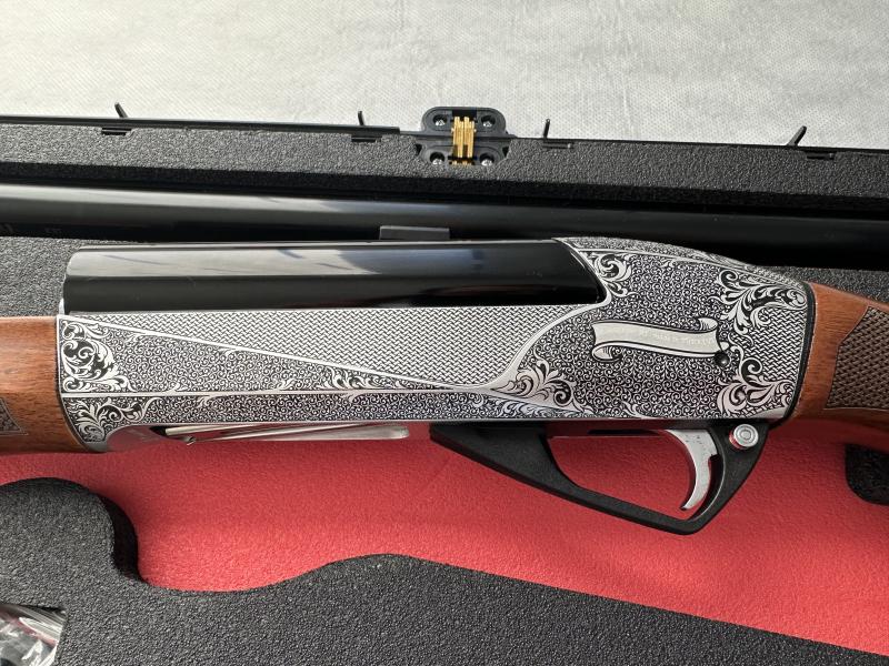 Pues así de primeras parece una Benelli por la linea de diseño, yo conozco a una persona que tiene una de estas y es la segunda temporada y está encantado con ella .Parece que estás escopetas van a pegar en el mercado.