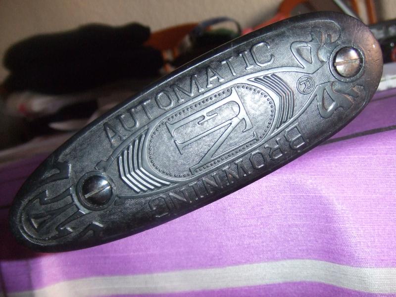 2ª La cantonera de la culata es modificada en varias ocasiones en la historia de la Auto-5, en 1963 el diseño y material es sustituido, del cuero prensado al plástico, también se cambia el grafismo.