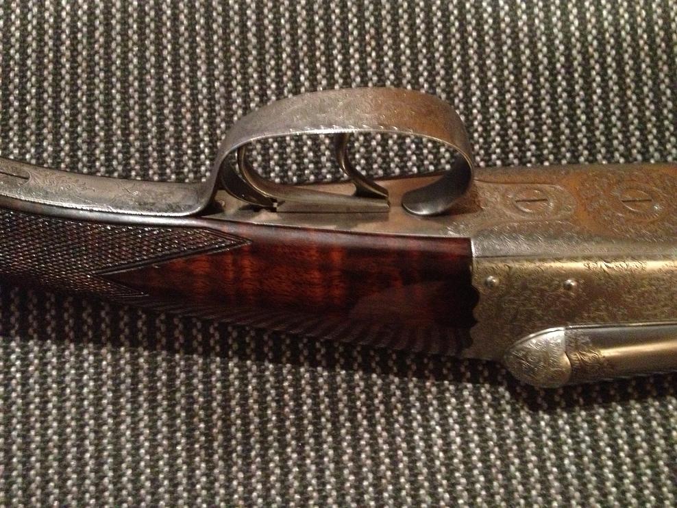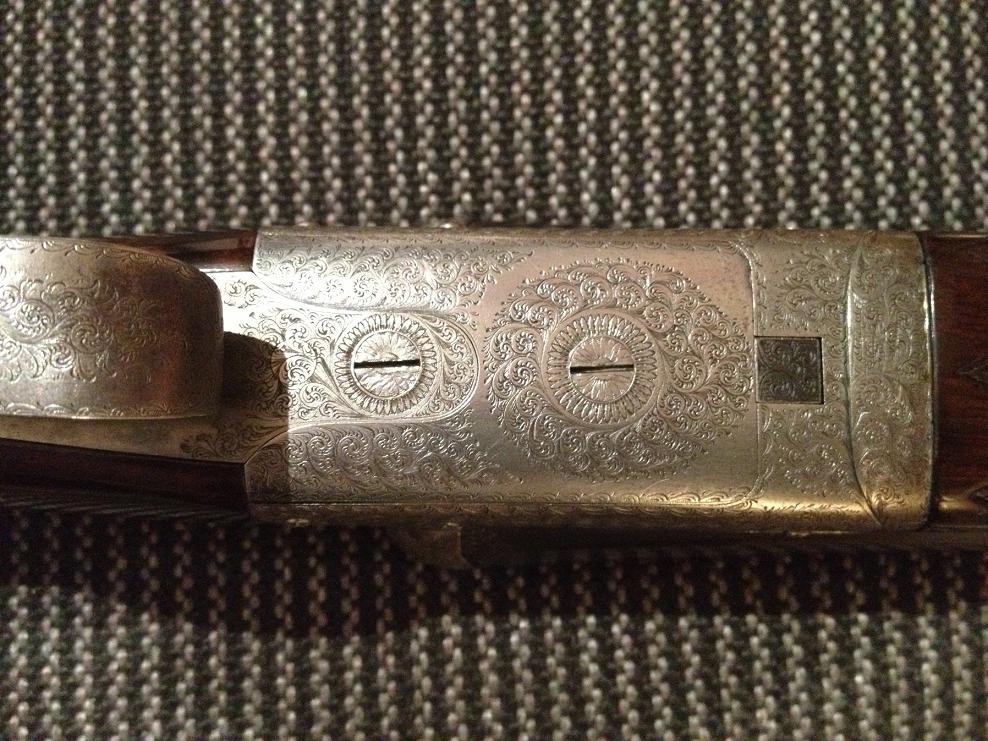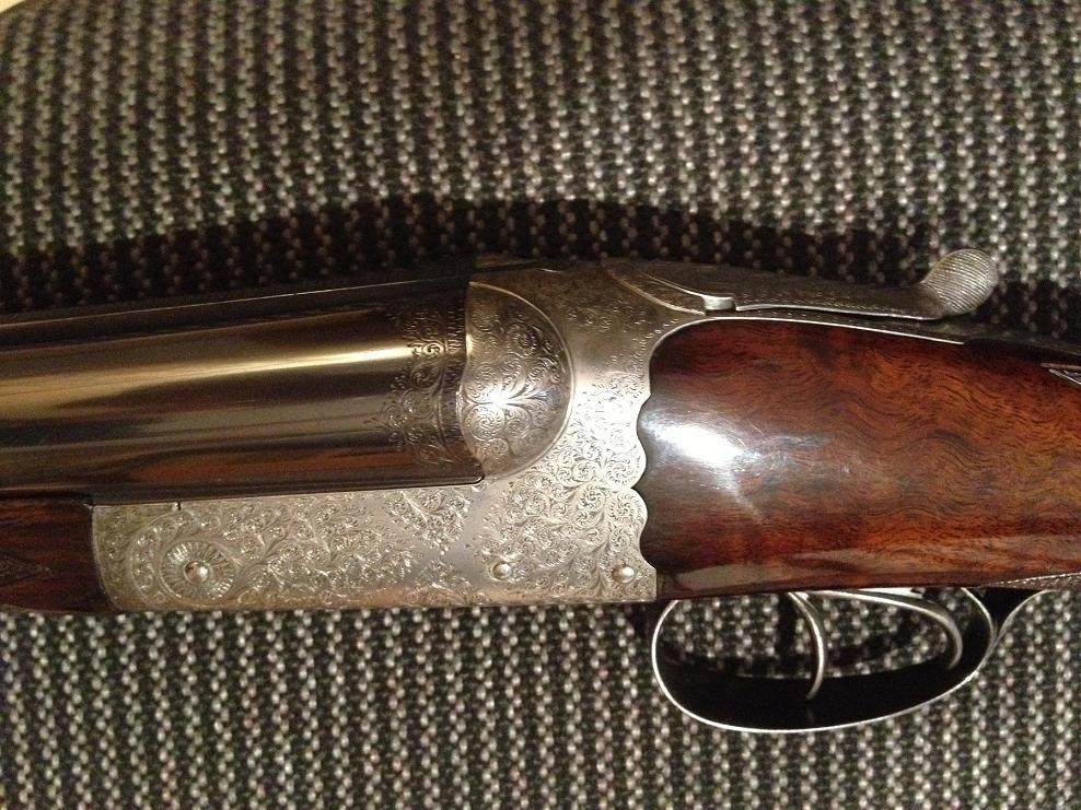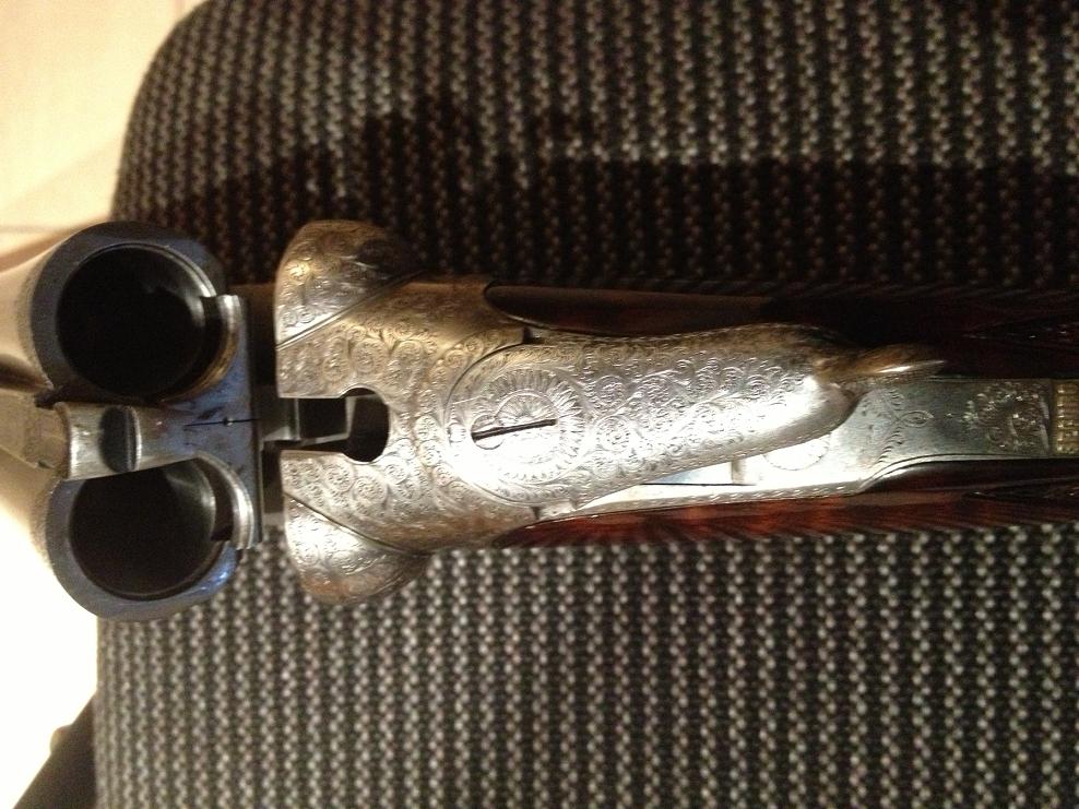 Lleva triple cierre Purdey como creo que lleva la tuya y es sistema Anson & Deeley cañones tipo demibloc, aunque el tipo de acero no concuerda el modelo se parece mucho, tienes que tener en cuenta que tanto los aceros Cokerill (Belgas) como los Krupp (Alemanes)son de calidad similar o sea lo mejor de lo mejor de su epoca, acero de diez sobre diez, yo diría que lo es.