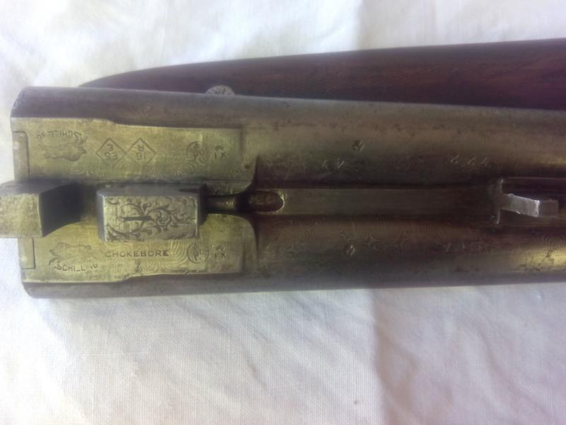 Aunque las fotos no son claras, da la impresión que se trata de dos escopetas distintas, porque en la parte superior de los cañones pone L. Vives y Cía. Barcelona y en la inferior Schilling. Me parece ver A. Schilling, pero no estoy seguro. Debería ser E.Schilling, ya que su nombre era Eduardo. Además los punzones típicos de Schilling no aparecen o no se ven. Es curiosa esta escopeta y lo único seguro es que es de cañones de damasco y que no puede tirar cartuchos actuales debido al peligro de explosión. Quizá los compañeros Cazuma o Pguaga puedan contarnos algo más.