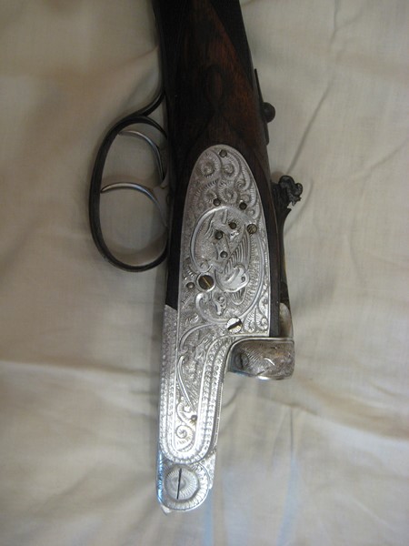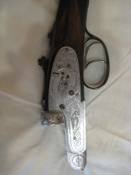 Tiene un muy buen grabado en la platina en plata vieja, lagrima en culata y salida de gases, grabado espectacular en la palanca de apertura!!!.....las maderas, pues como todas, excelentes escopetas yuxtapuestas, pero que la maderas de esa época dejaban mucho que desear!!
