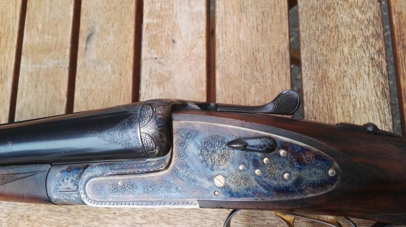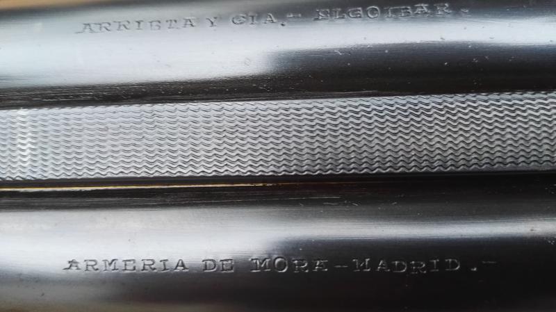Buenas. Hace poco cayo en mis manos esta escopeta. Es una Arrieta y Cia con la inscripcion en un cañon de Armeria Mora de Madrid. Tiene buenos grabados y detalles en dorado, expulsores, gatillo articulado, en fin, todo lo necesario para hacer que sea una escopeta fina.