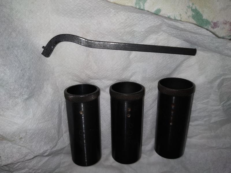 Hola compañero, por lo que llego a ver no llevan rosca , creo que son unos choques que se ponian dentro de un adaptador que iba roscado a la punta del cañon de las semiautomaticas , si no recuerdo mal los comercializaba Excopesa , llevaban un tubo roscado al exterior del cañon , al que previamente se le habia cortado la parte del cañon que hacia el choque , luego estos choques estaban insertados dentro y con una especie de tapa roscada al exterior del acoplamiento que iba en el cañon , no se si me he explicado bien, creo que son esos , espero haber ayudado. Saludos y aroma de polvora.