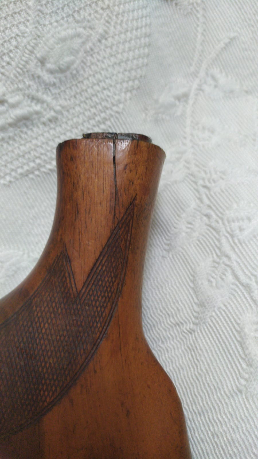 Y quitando el pegamento que me han recomendado en la ferretería una cola de madera con resistencia D4 en vez de el araldite standard ( no sé qué os parecerá) me animé y me he puesto a intentar arreglarla,los trozos que faltaban en la garganta los he repuesto con masilla patex y ha quedado bastante bien, al raspar la cola antigua se vino algún trozo de madera pegado el armero que arreglase eso era un auténtico chapuzas y la cola que uso se quitaba solo raspando un poco con la navaja.