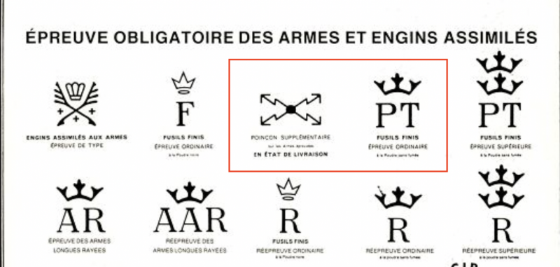 P T es lo único que vieron por ahí... no es el fabricante. Es un punzón del Banco de Pruebas de Saint Étienne, Francia, el otro marcaje es también un punzón.