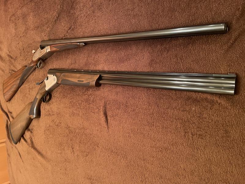 Ambas son de dos cañones, ambas del mismo cal. el 20, ambas son monodisparador, ambas son Expulsoras. ambas pesan exactamente lo mismo (2.825gramos..), ambas son recamaras 20-76, ambas son basculas en acero...pero son muy distintas, la una tiene los "ojos" como yo "paralelos", la otra uno encima del otro, la una dispara secuencialmente sin selector y nunca falla aun que falle el primer disparo (la Arrieta), la otra tiene selector pero necesita el retroceso del primer disparo para poder efectuar el segundo, la una tiene chokes fijos *-***, la otra tiene chokes intercambiables, la una es muy bella a pesar de ser muy mayor, la otra es joven y moderna, la una tienee los caños de 71, la otra de 68, pero se pueden usar chokes exteriores que la "alargan", la una esta muy suave y ajustada, la otra necesita aun muchos tiros para perder la "rigidez" y dureza. La una esta echa con kos mejores aceros y ajustes y sus buenas echuras se notan en la mano y en la vista, la otra sin ser "mala" no lse puede comparar . Dos armas muy utilizables y capaces que comparten detalles y que les separan muchos mas. En su dia la una costó 4 veces lo que la otra, sin embargo hoy en dia quizás su valor este equiparado lamentablemente.