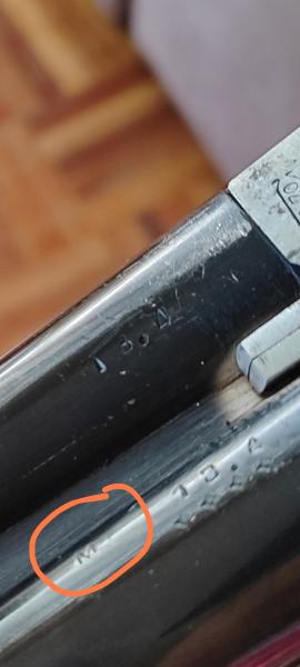 Creo que encontré la bendita letra, está en el cañón e igual se vea regular por lo que me comentabas del pulido en enjoyado. Veo una "M" clara pero no creo que sea tan antigua la escopeta no? La "M" según lo que me enviaste corresponde a 1941.