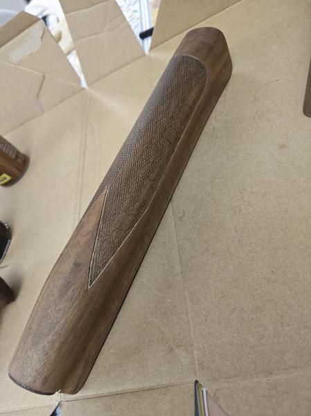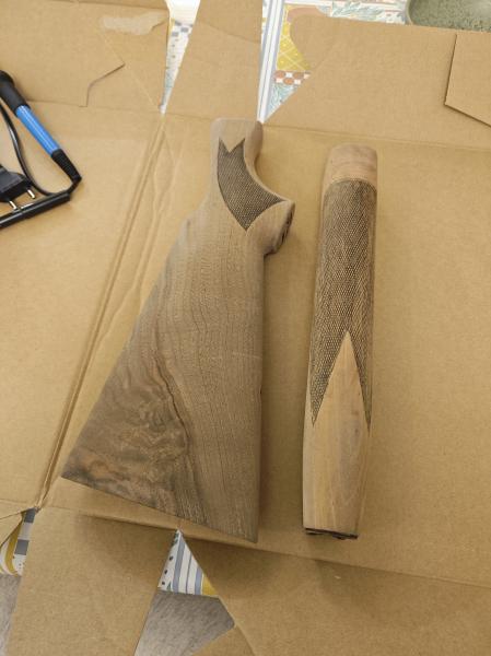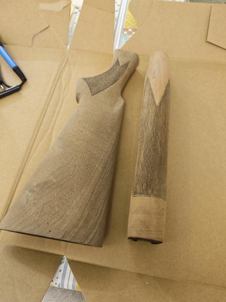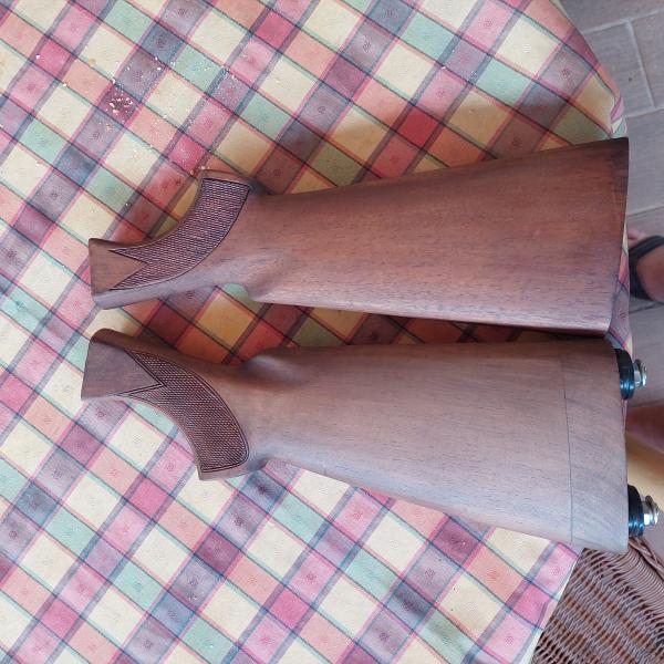 Hola, dos culatras de Benelli 201 del calibre 20, dos maderas diferentes, a una le puse una taco de madera para alargarla. Lijadas, teñidas con nogalina y después aceite de linaza ...