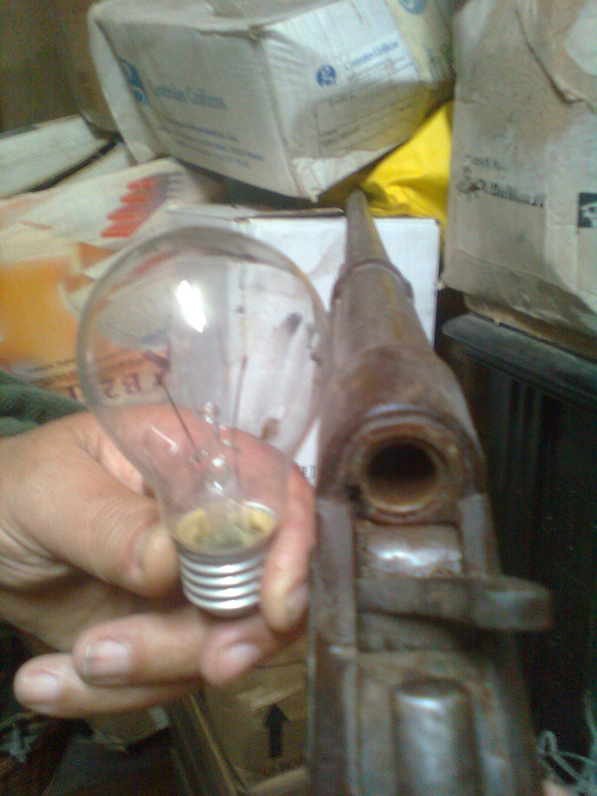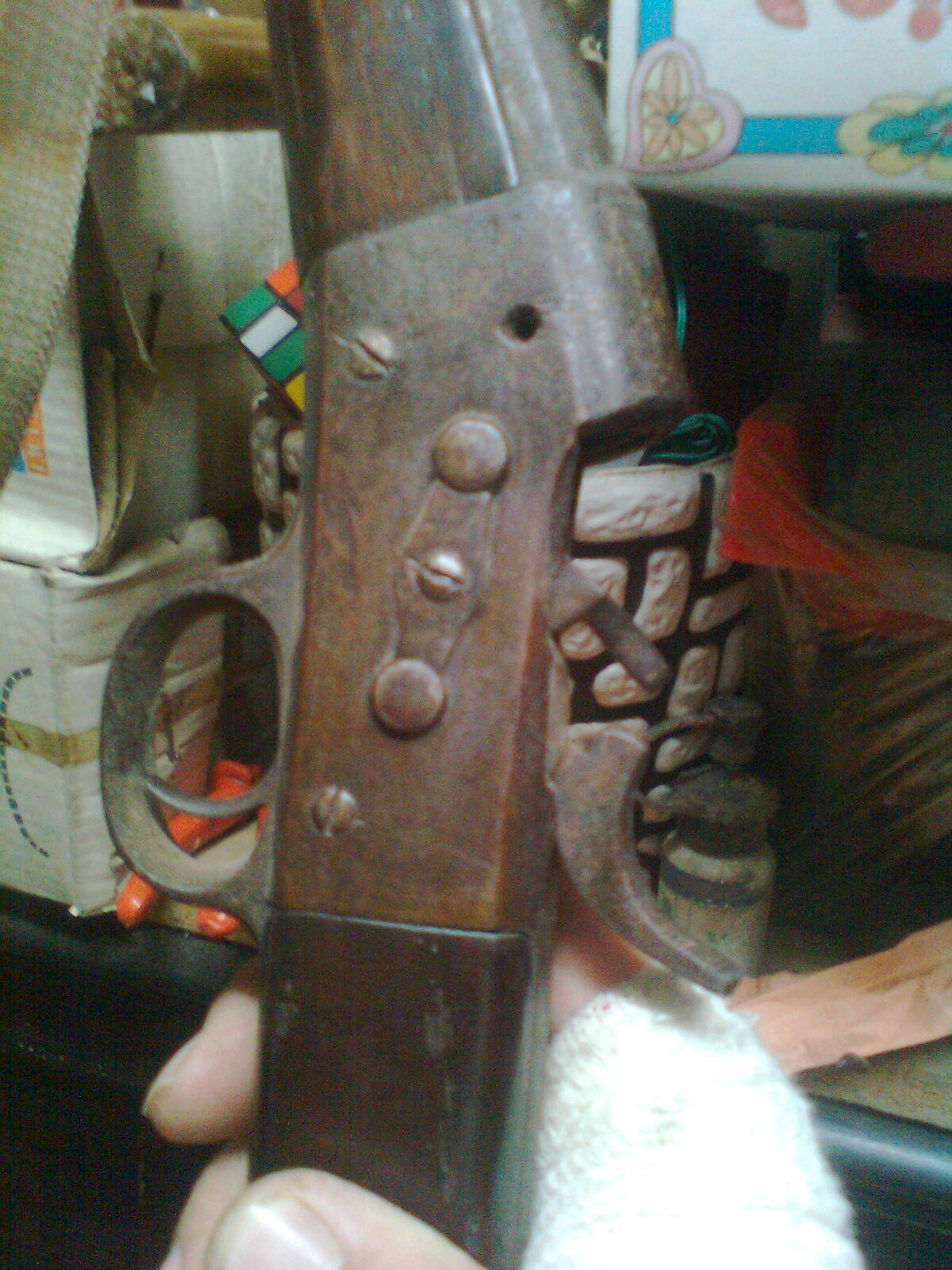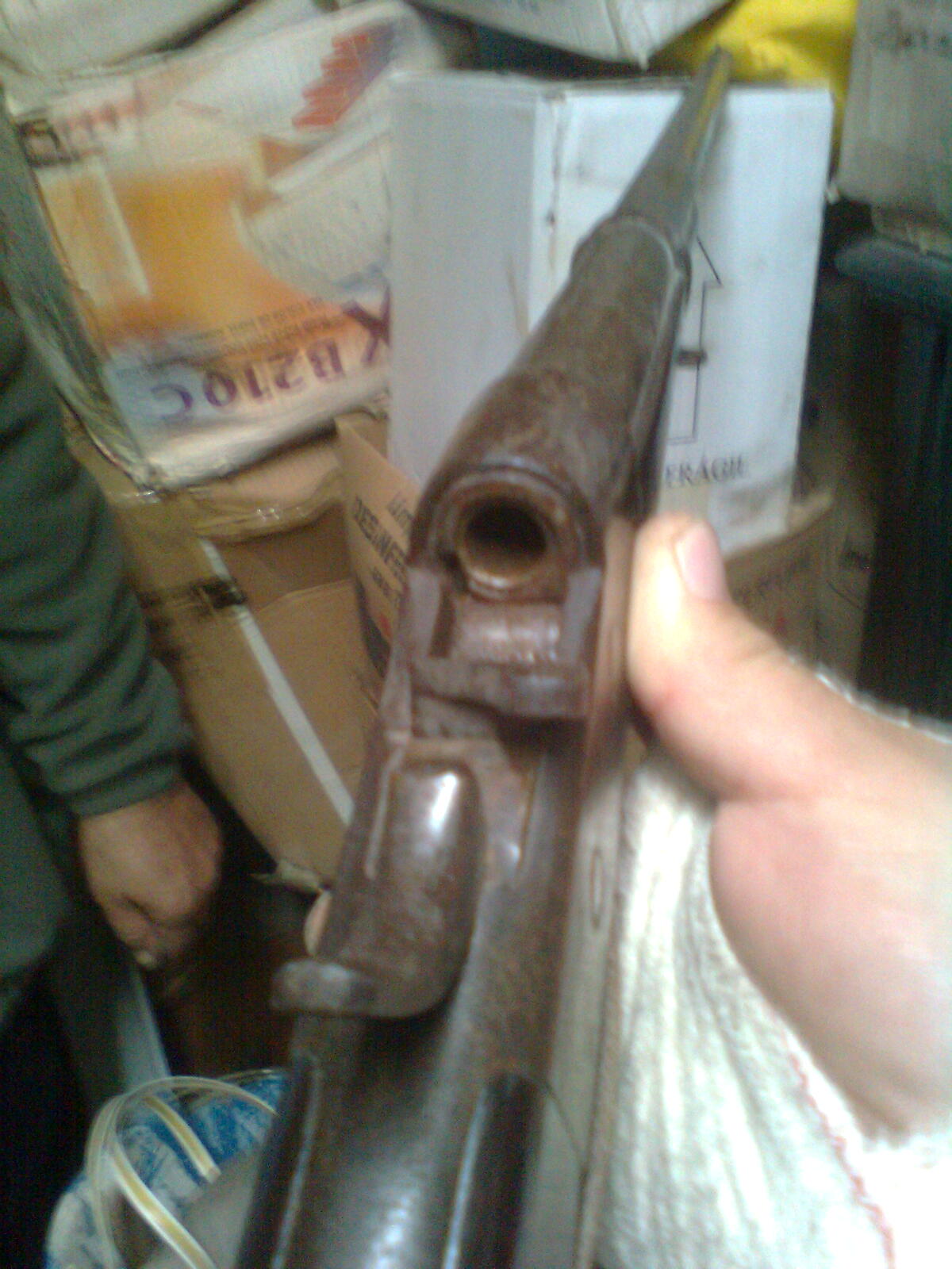 B.noches, no ,no lo he encontrado tirado.Su propietario, que lo tiene, sr ya con sus años me comentó que fu´e de su abuelo y que de aquella le hizo la culata.Me llama la atención que el anima del cañon es lisa, no tiene estrias.El cerrojo cirra el cañon por detrás como si fuera una pieza de artilleria y el marillo golpea sobre ella golpeando el "perillo".Es bastante curiosa, aparte de no tener mira trasera.Haber si puedo poner alguna foto mas.