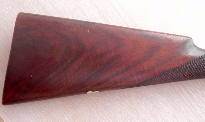 Indicadores de posición de los martillos, tornillo pasador de orejeta, buena madera de nogal...Me imagino que dobles llaves de seguro... ¡Estupenda escopeta!