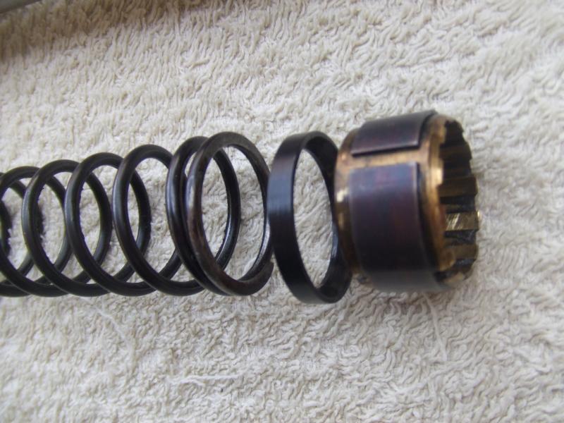 En la posición de carga fuerte el anillo de frenado (bronce) tiene la posición que veis en la foto con la forma de garra mirando a la rosca, así como el anillo de fricción (acero pequeñito) en el que la parte cóncava tiene que estar mirando al de bronce y la parte plana tiene que estar contra el muelle amortiguador.