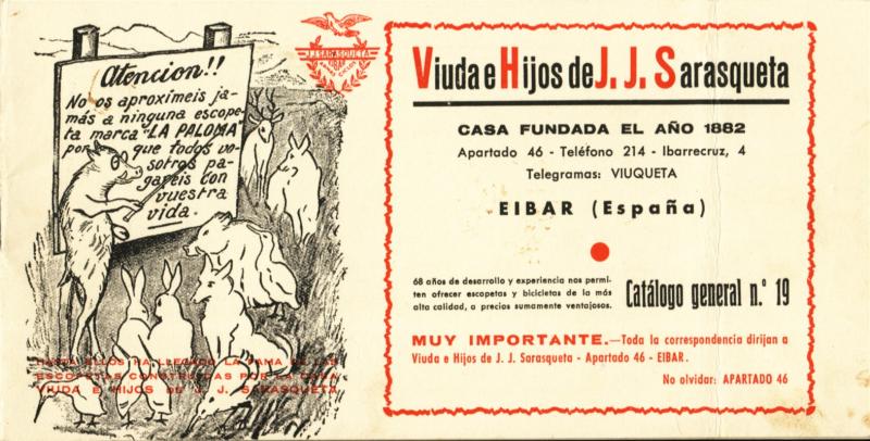La Paloma era la marca y logotipo de J.J. Sarasqueta y de Vda. E Hijos de J.J. Sarasqueta. Adjunto portada de un catálogo del año 1922.