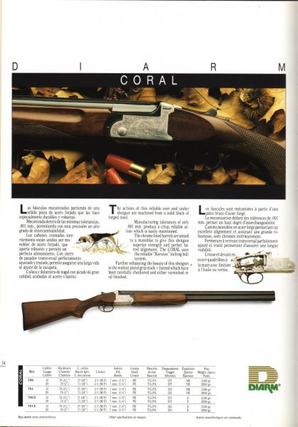 Rebuscando por la red he encontrado las dichosas Yeoman superpuestas, entre las cuales también hay diferencias de unas a otras. Un tipo es igual a la Sarriugarte 200 y otro es exacto a la County, la diferencia reside en el corte posterior de la báscula, aunque básicamente son la misma escopeta. En el catálogo de DIARM figuraba como modelo CORAL.