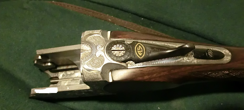 Os pongo unas fotos a continuación a ver que os parece y para ayudar a la identificación. Comentar tambien que está ajustadísima, parece que lleve la grasa original y que no haya disparado ni un solo tiro. Está impecable y tiene un plomeo espectacular entre los 20 y 40 m. (La he probado en el plafón del campo de tiro). Por cierto lleva chokes fijos de 3*** abajo y 1* que vienen grabados en los cañones. Y en la palanca de apertura lleva las letras AS,que no se que significan ?