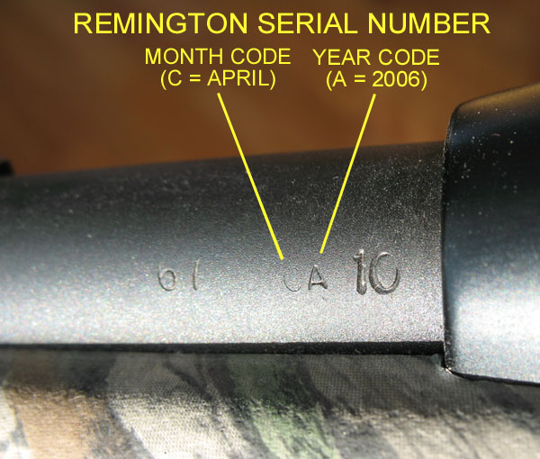 Ejemplo: N123456V, la letra anterior indica la época, no el año y la posterior el calibre y morfología de la recamara así como del cajón de mecanismos, en la imagen de una página oficial de Remington que pongo esta todo el listado de posibilidades de la letra posterior, en este ejemplo la letra V representa el calibre 12 y la recamara de 70,así como la morfología subyacente del cajón de mecanismos.