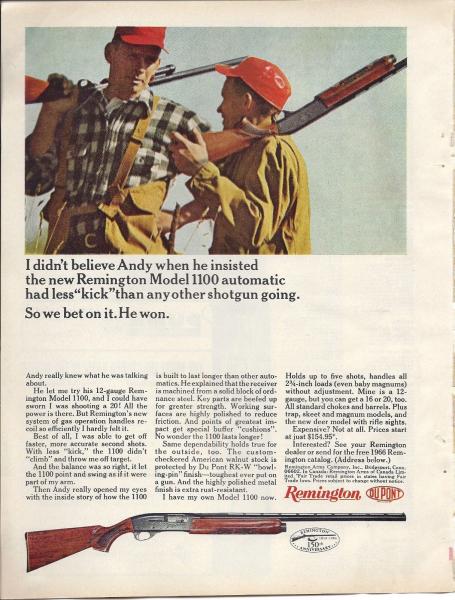 En la primavera de 1963 es lanzada al mercado la Remington 1100, después de tres años el equipo de Wayne Leek ha creado una escopeta que cambiara el mundo de las semiautomáticas para siempre.