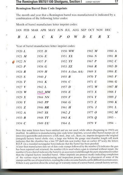 1º CASO: Según ellos si se repite la letra cosa 100% cierta en armas que se haya producido durante bastantes años como es el caso de la 1100 o 870 el propietario tiene que tener su referencia temporal de cuando más o menos se produjo dicha arma y en base a ella elegir la fecha que concuerde con la letra marcada en el cañón, increíble pero cierto.