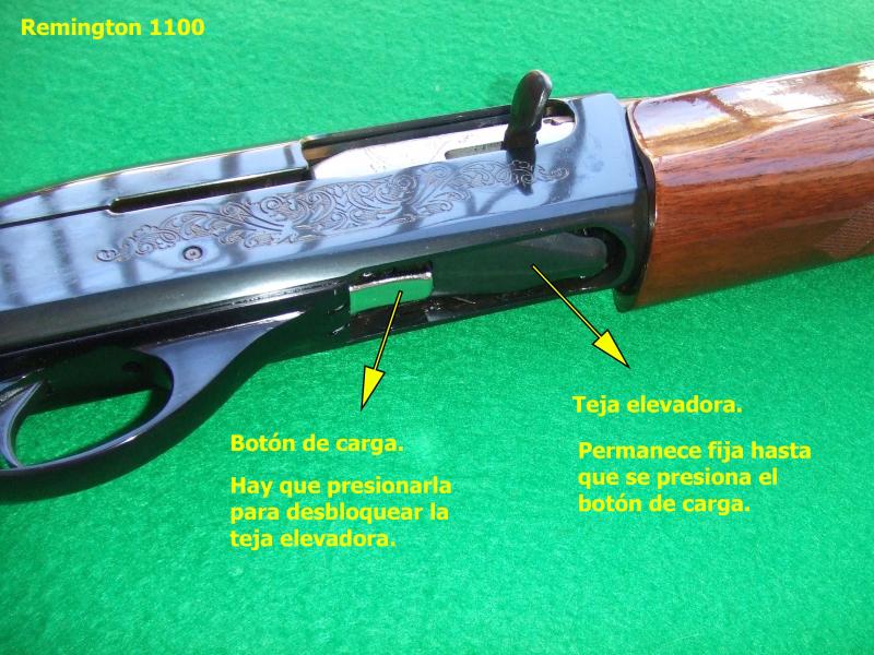 Lo primero que advertimos es la falta del típico botón de carga que la mayoría de las semiautomáticas tienen situado en el lateral derecho del cajón de mecanismos, en la Remington 1100 se opta por una posición de dicho botón en la parte trasera de la ventana de alimentación y tiene una forma rectangular alargada, este botón está totalmente asociado a la teja elevadora de alimentación del arma así como al grupo de disparo.